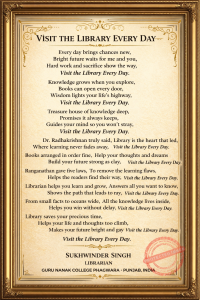 VISIT THE LIBRARY EVERY DAY Every day brings chances new, Knowledge grows when you explore, Treasure house of knowledge deep, Dr. Radhakrishnan truly said, Books arranged in order fine, Ranganathan gave five laws, Librarian helps you learn and grow, From small facts to oceans wide, Library saves your precious time, |
