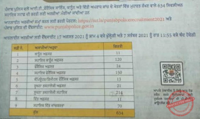 Punjab Police 634 Special Cadre Posts  Basic Information